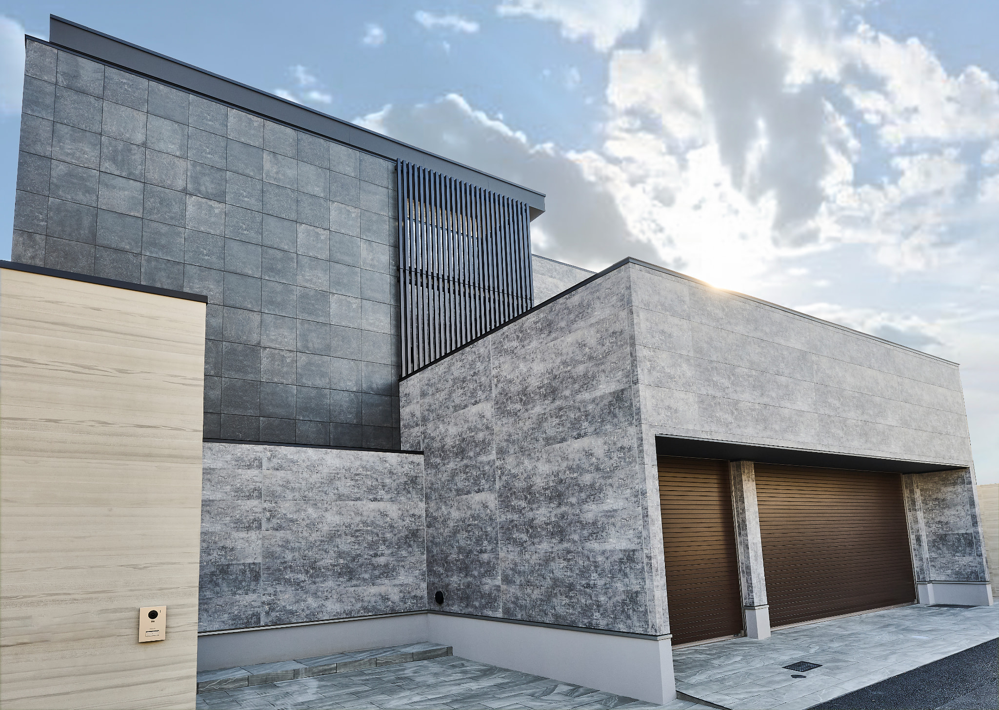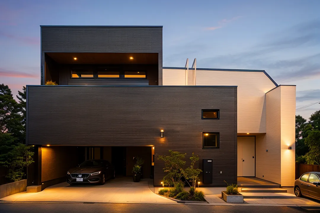 ブラックで統一された、屋上バルコニー付きの3階建てのお家です。
