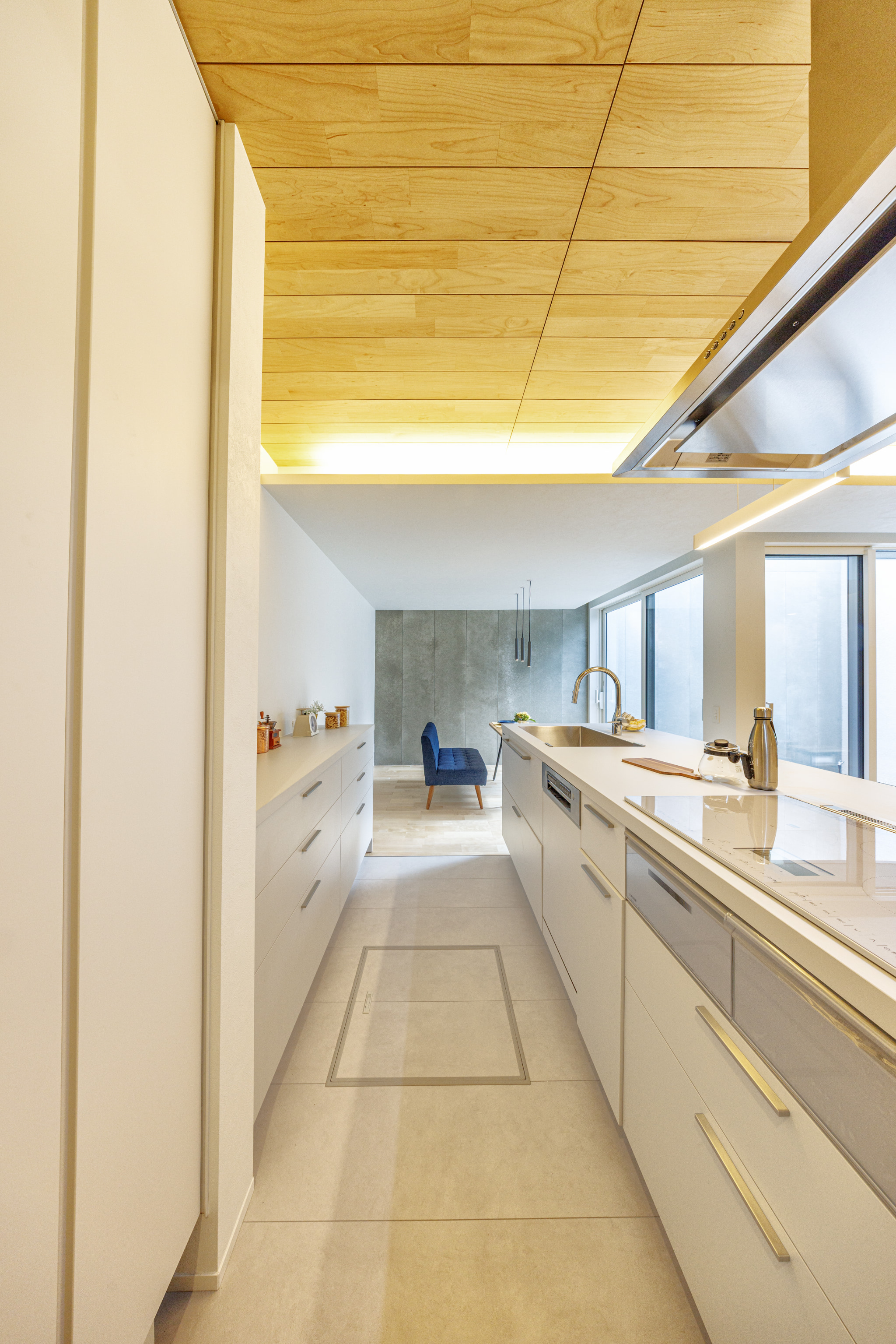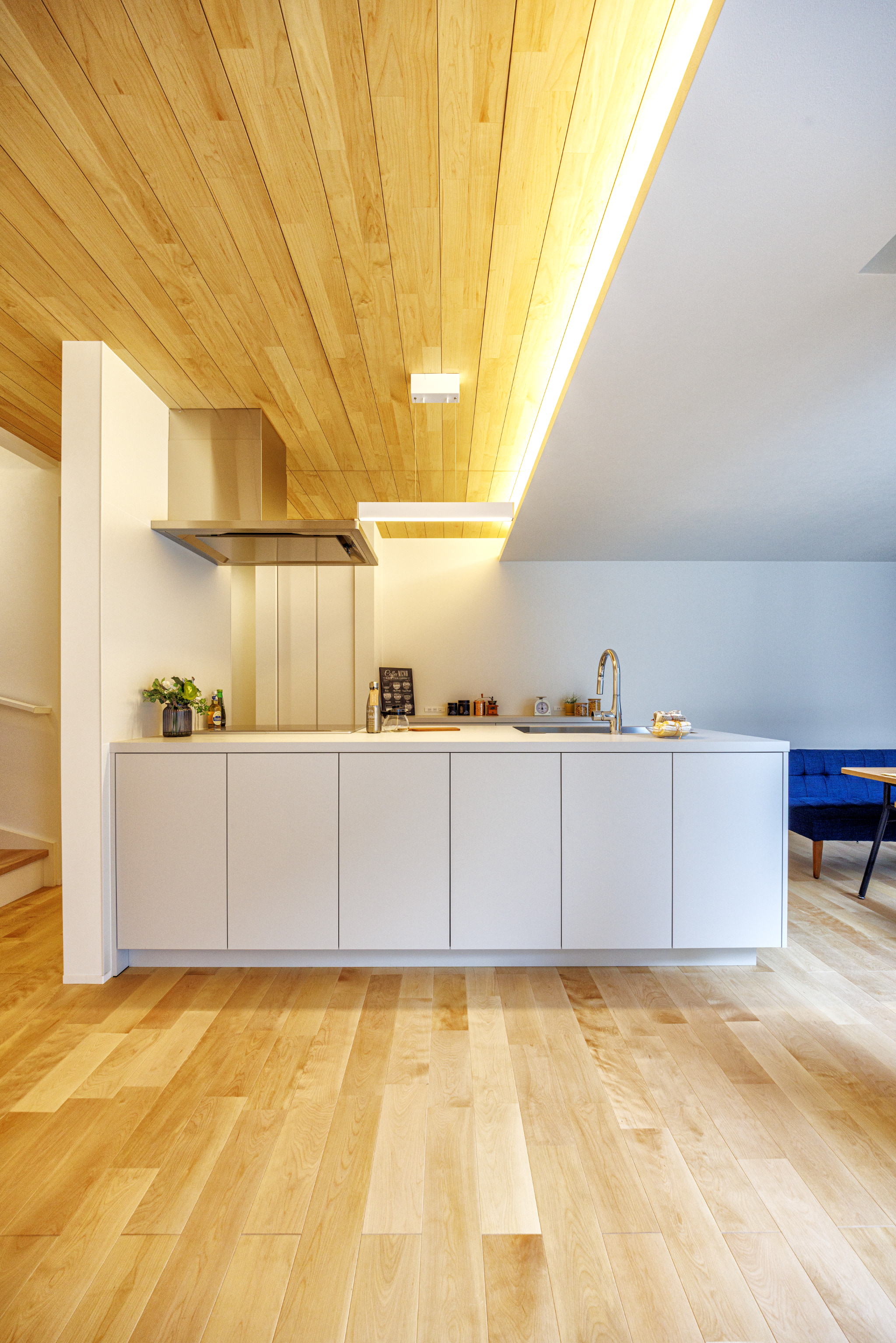 カバの無垢床・天井には突板を採用し、自然素材を生かした空間へ。