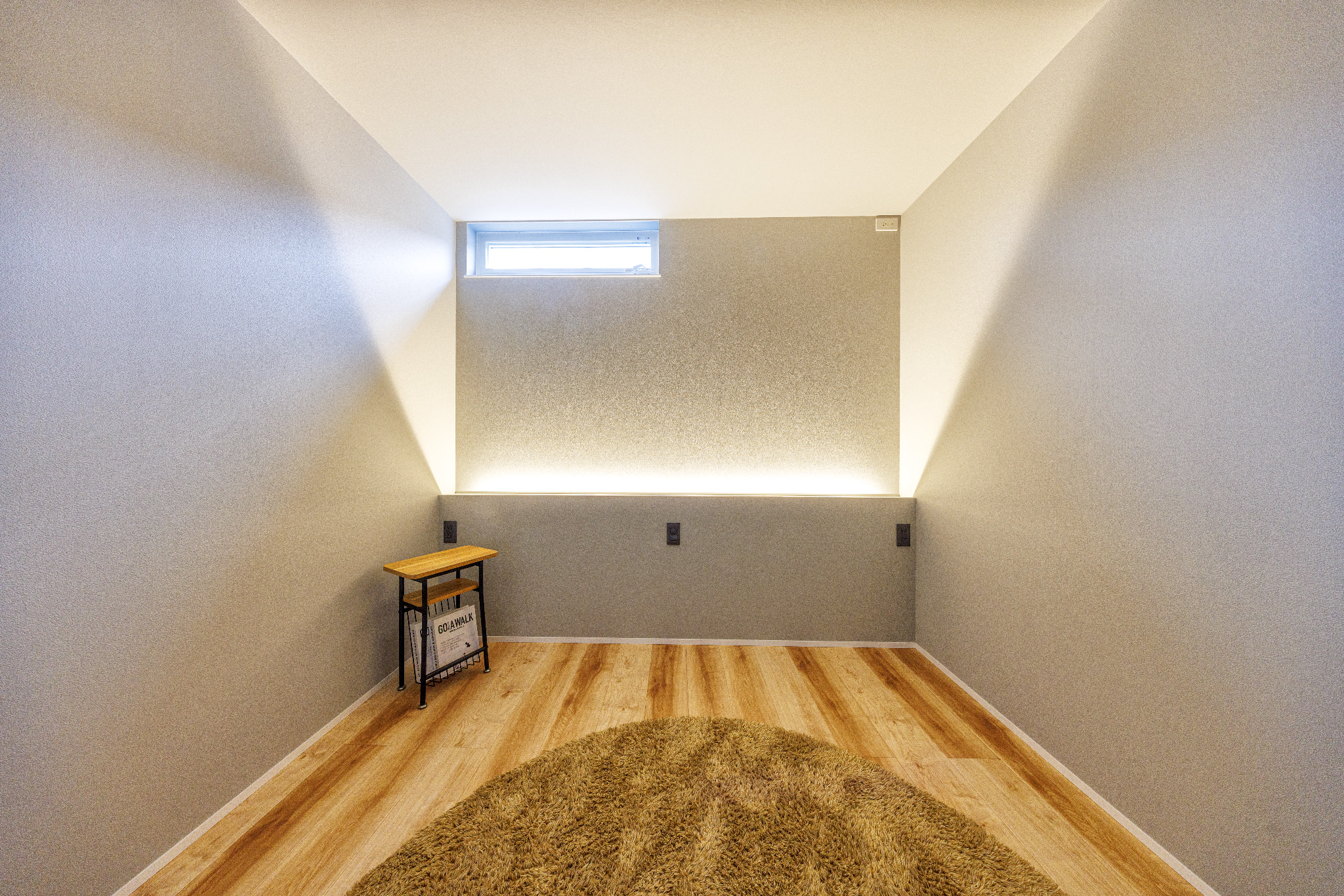 腰壁に間接照明を入れた、雰囲気のある寝室。
