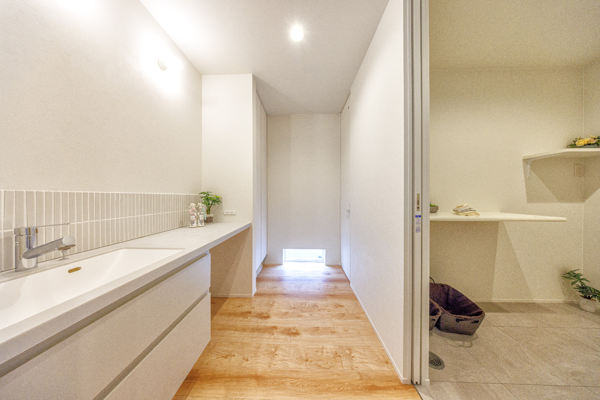 ワイドタイプの造作風洗面台。