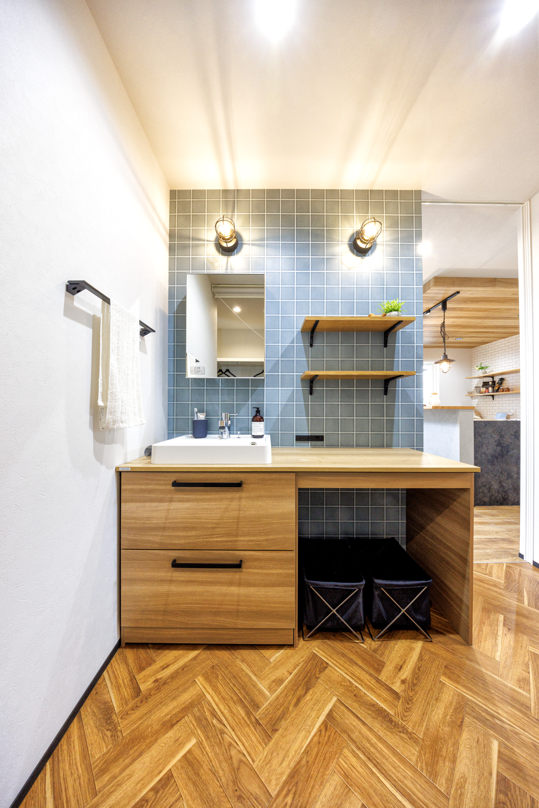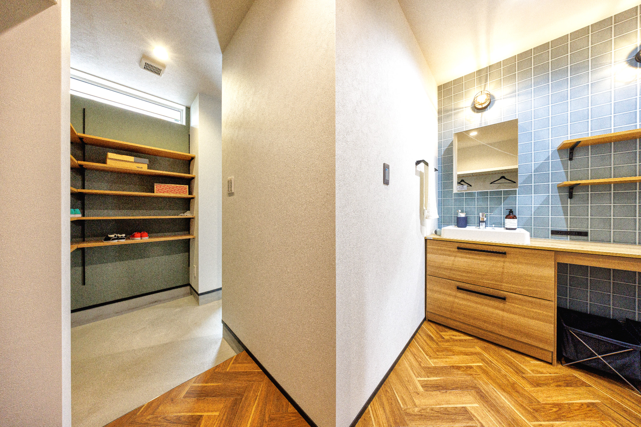 シューズクロークから直結する造作風のおしゃれな洗面化粧台。