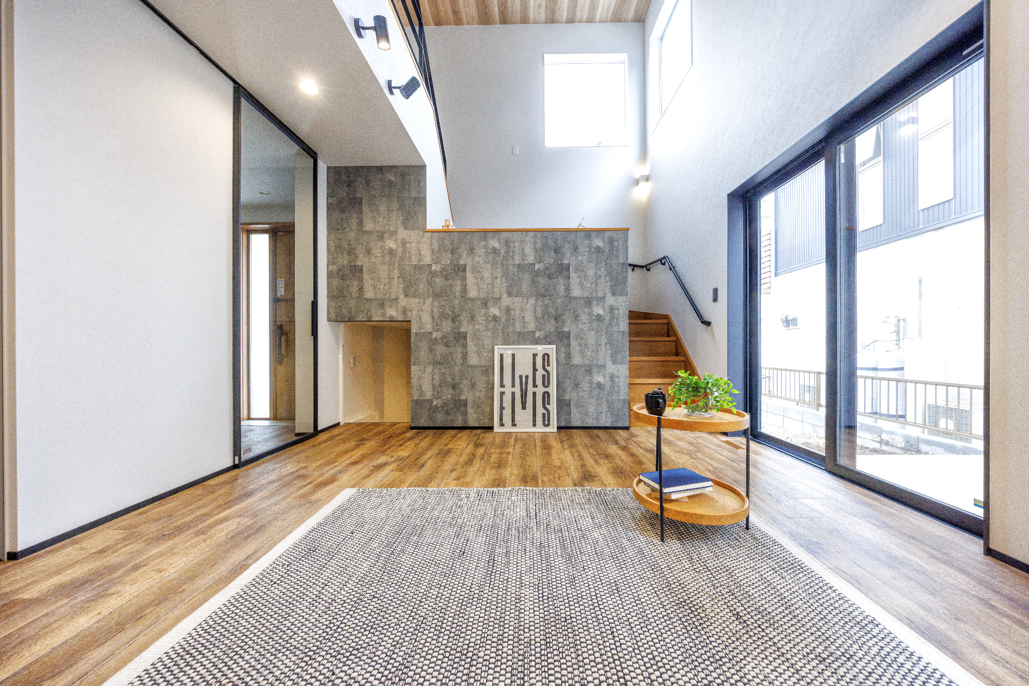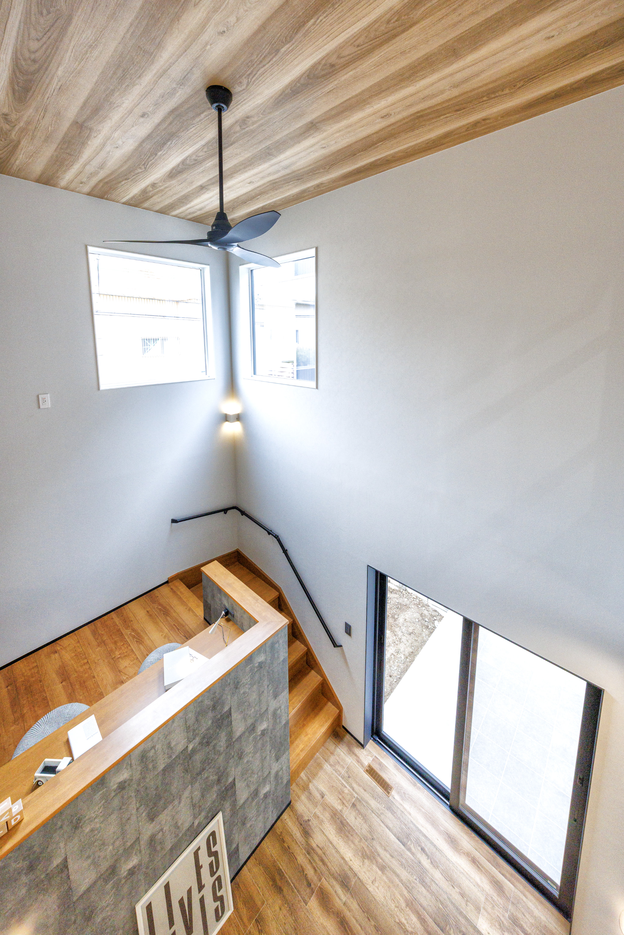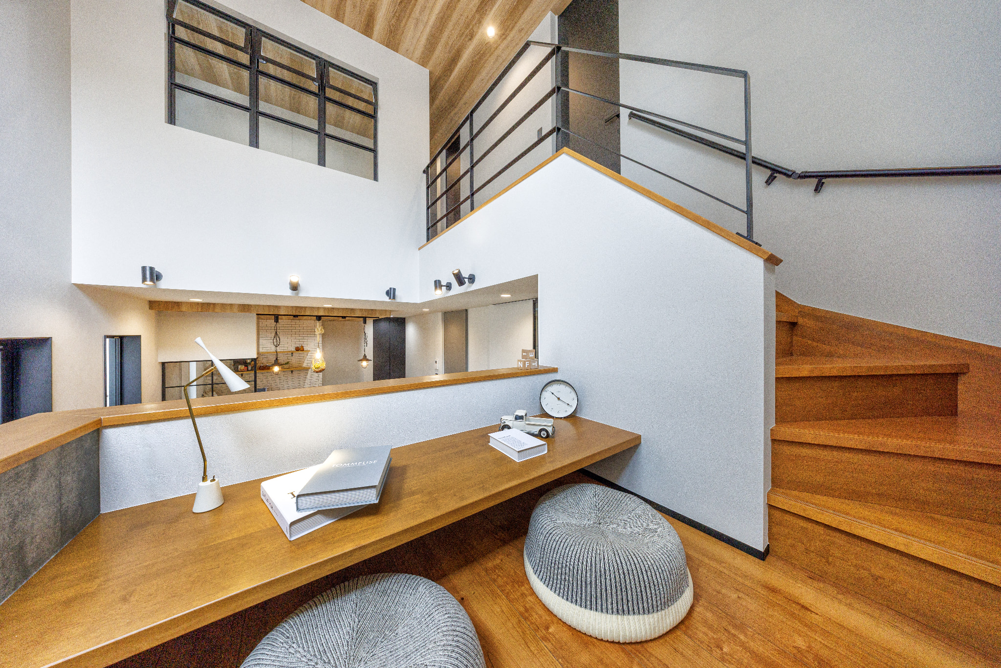 前面に室内窓を設け、吹き抜けを通してLDKにいるご家族様の存在を感じることができるような工夫がされています。