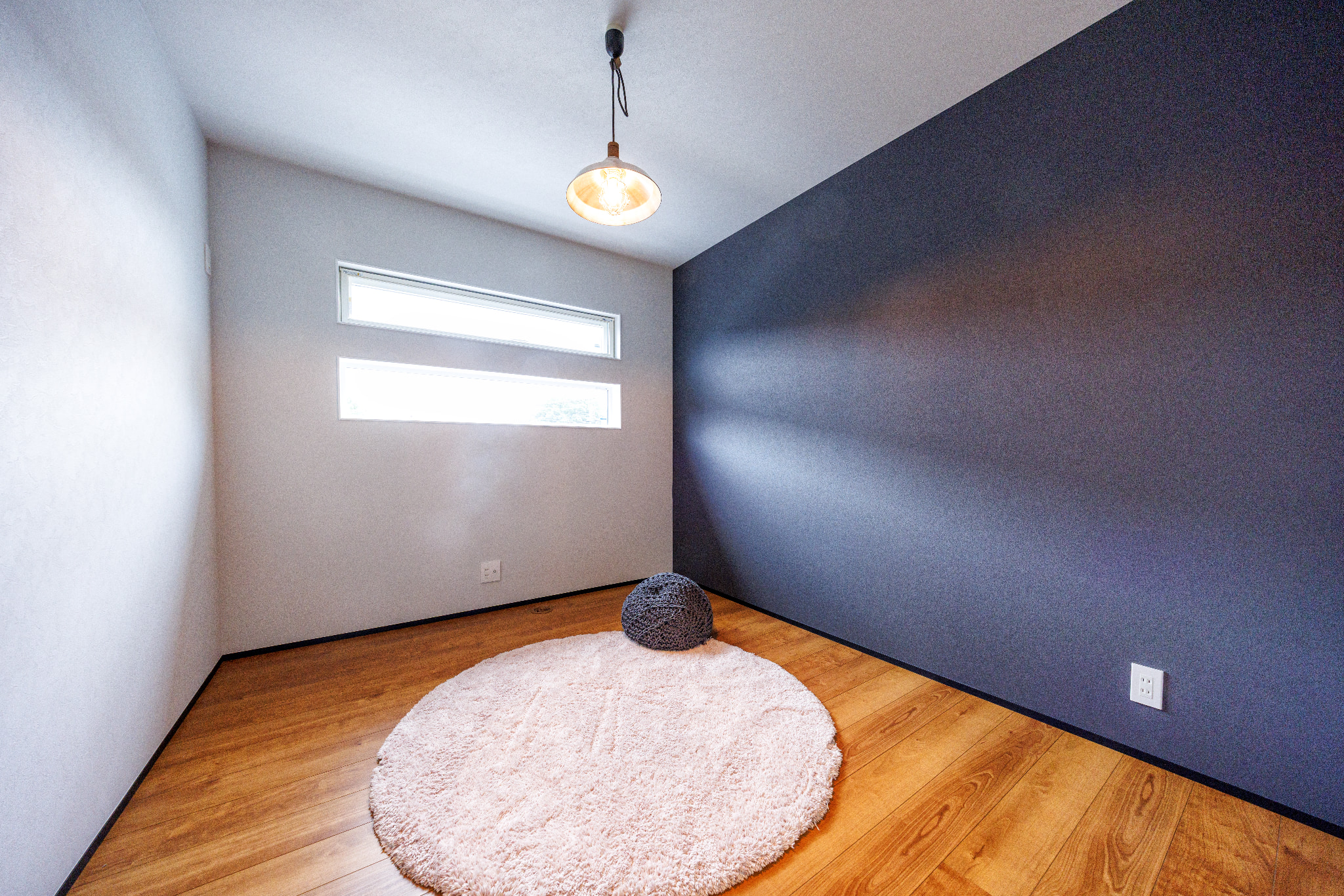 床は木目のフロアタイル、アクセントに暗めのお色味のクロスやドアを採用いただき、引き締まった印象へ。