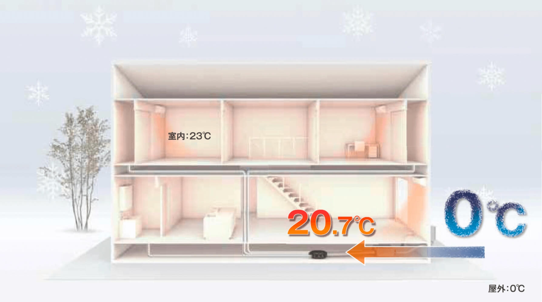 熱交換で冷たい空気が暖められ、室内温度に近い状態で室内に❗️