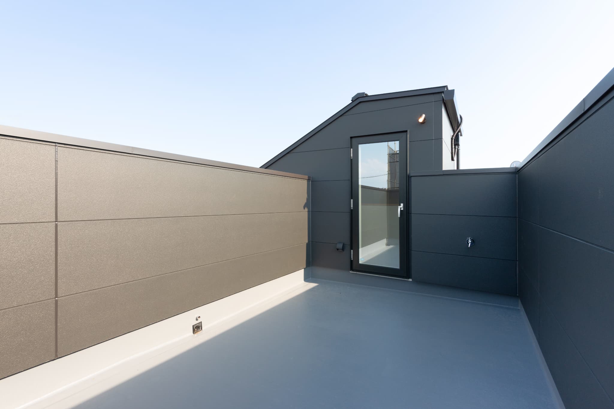 ブラックで統一された、屋上バルコニー付きの3階建てのお家です。