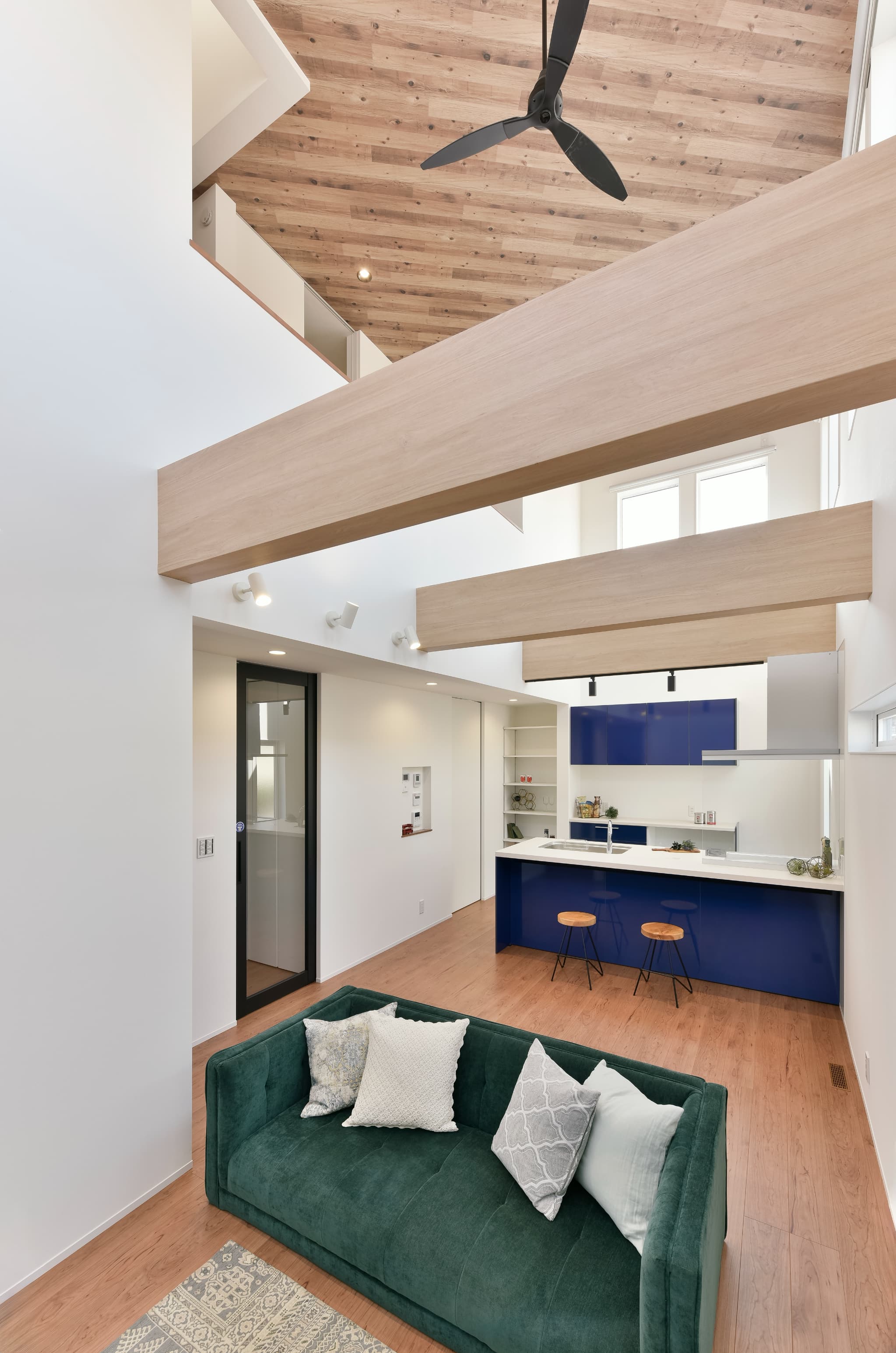 ブルーが映える大型吹き抜けで家族の心も空間もつなぐ