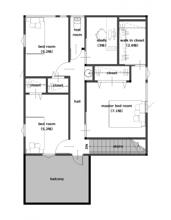 2階には、主寝室と子供部屋に加え、リモートワークに最適な「書斎」と大容量の「WIC」を配置。