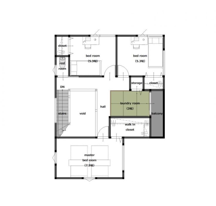 特筆すべきは、2階に配置された「ランドリールーム」。 本来、2階に水回りを配置することは構造的な制約を受けやすいものですが、自由度の高いSE構法ならば、家事動線を最優先した大胆なレイアウトも思いのままです。重たい洗濯物を持って階段を往復する必要は、もうありません。