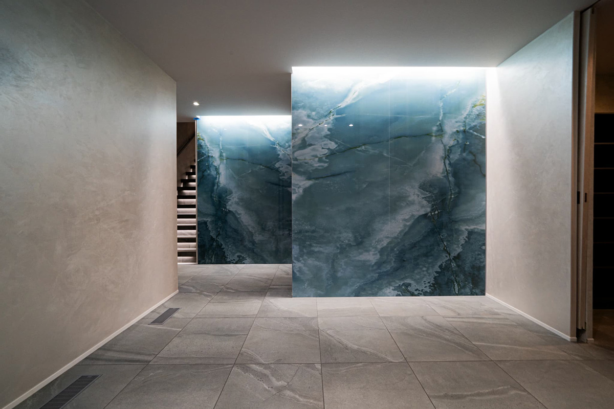 さらに、2面の壁には一枚の大判タイルをアクセントとして採用。