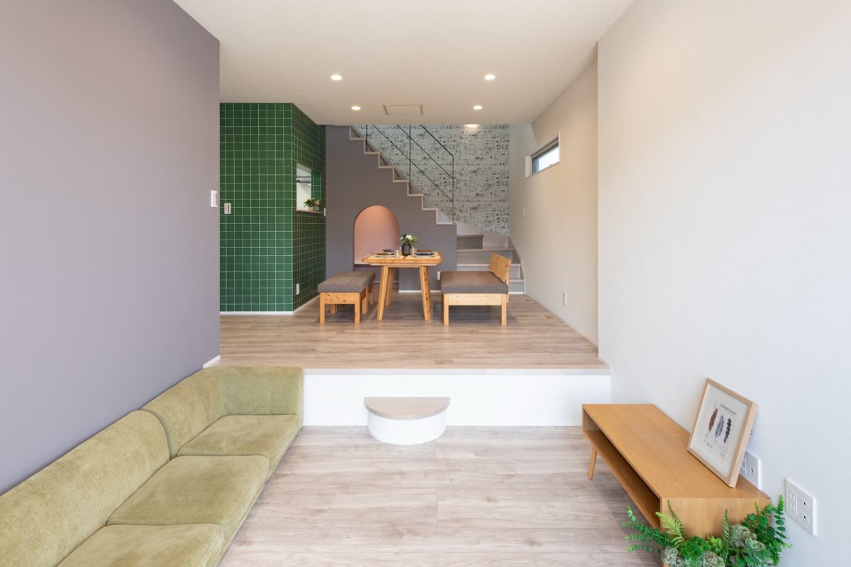 ダウンフロアのリビング、ステップは小さく、アーチ状にしたのがこだわり。