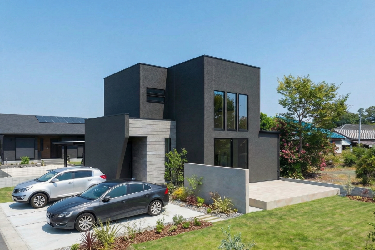 ブラックとグレーで引き締めたスクエアタイプのお家。