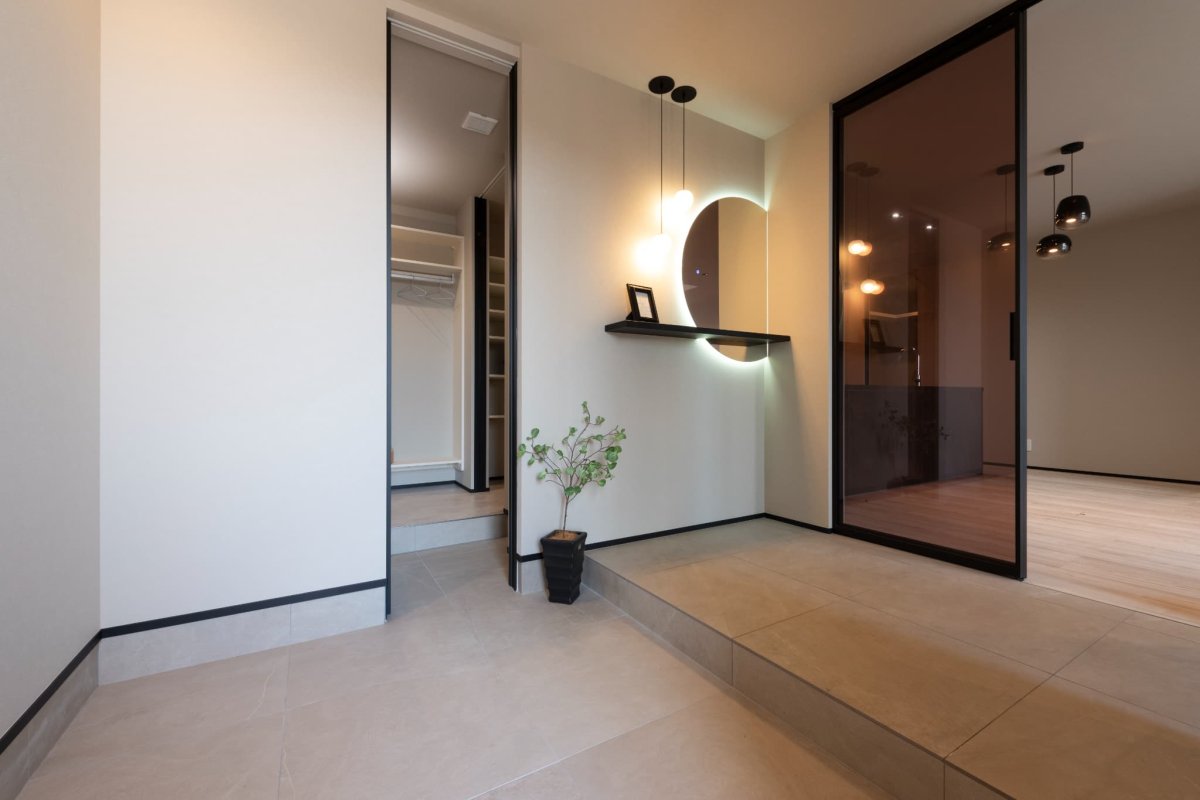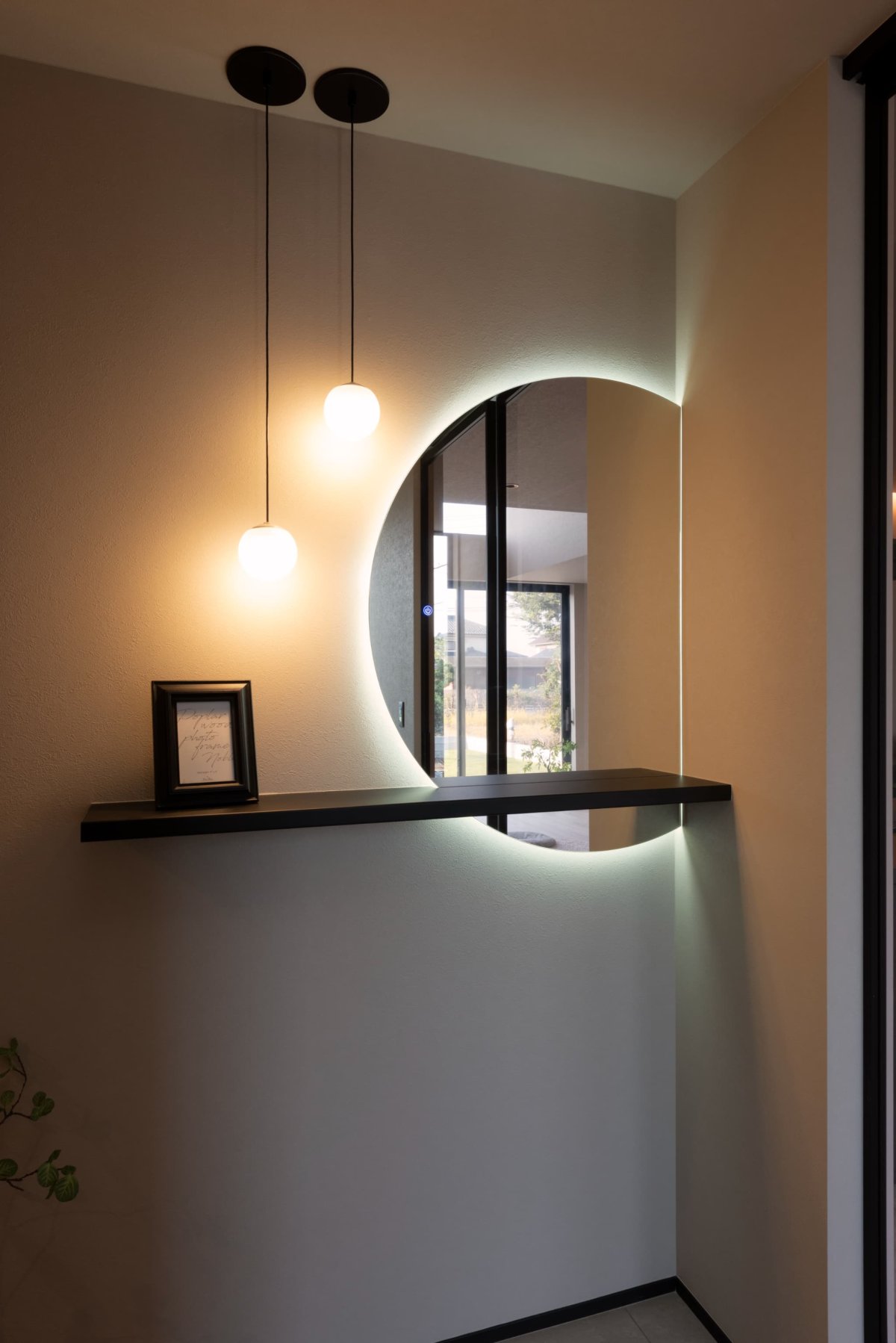 玄関ホールには造作の玄関ミラーを設け、特別感のある雰囲気に。