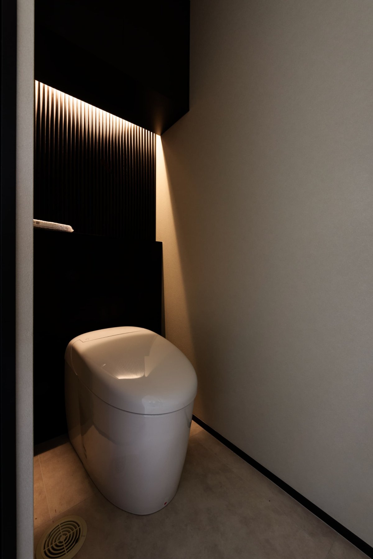 1Fのトイレは間接照明が映える、落ち着きのあるホテルライク仕様。