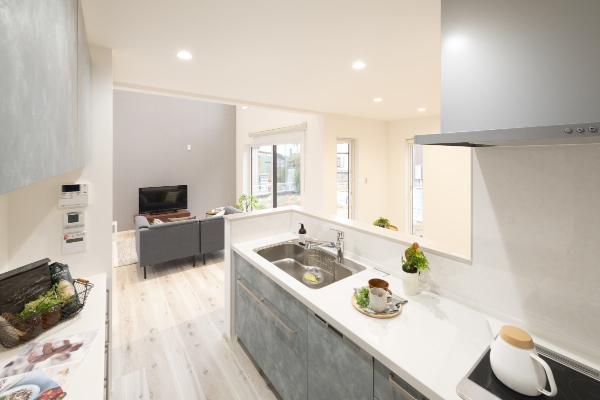 キッチンからリビング全体を見渡し、ご家族様の顔を見ながら家事ができるので自然と会話が弾む間取りとなっています。