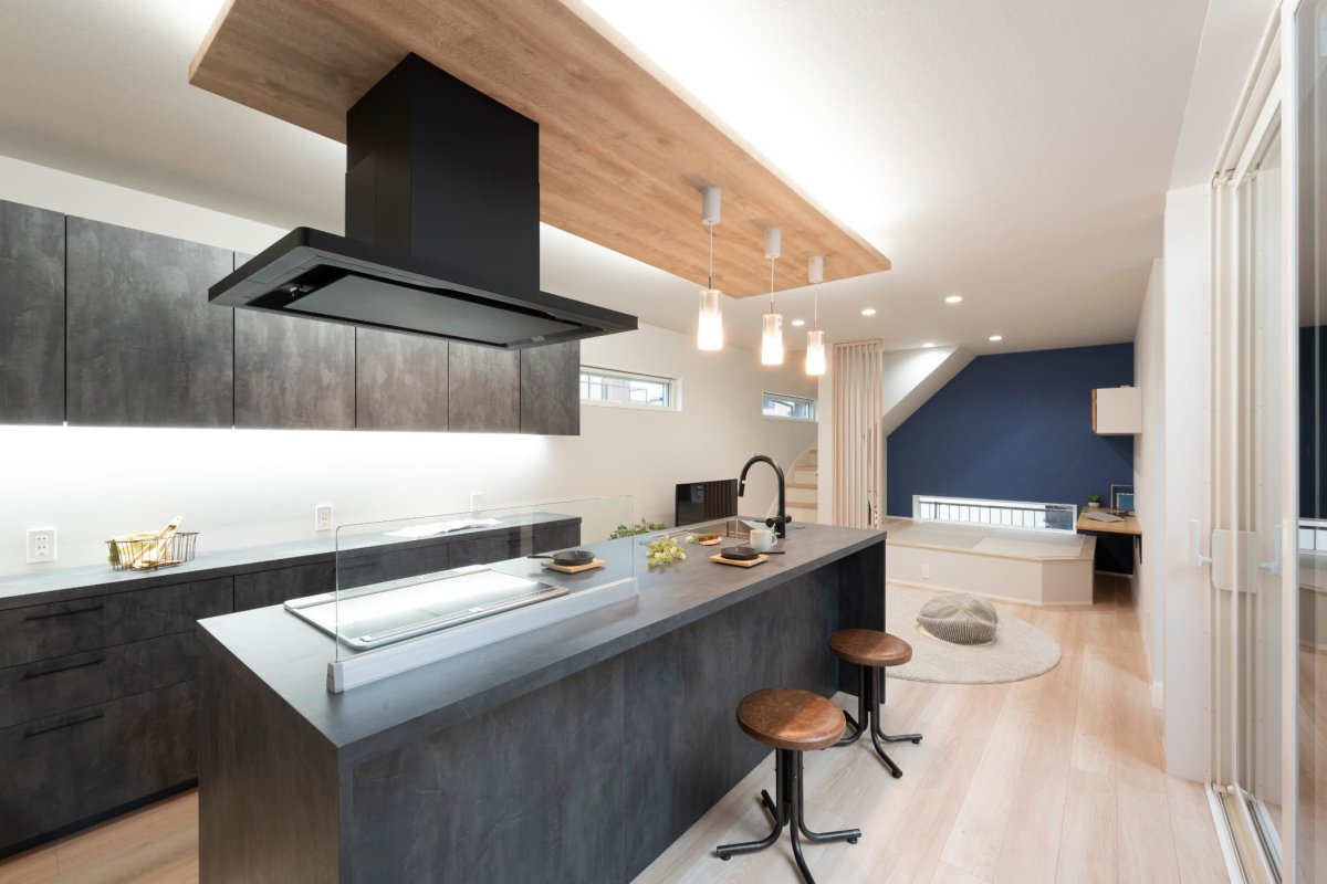 オーナー様こだわりの間接照明とグラフテクトのアイランドキッチンがお部屋全体のアクセントに!