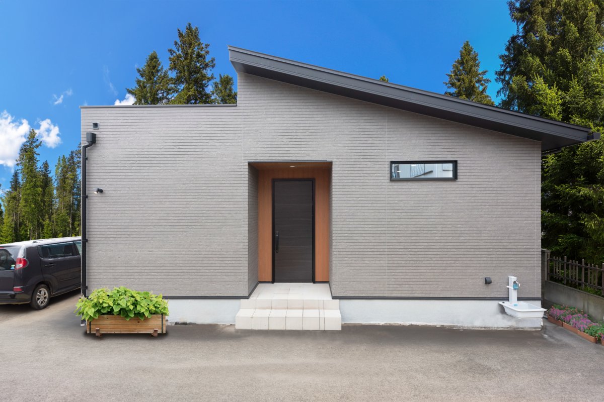 グレーの外壁に木目のアクセントで落ち着いた印象の外観。