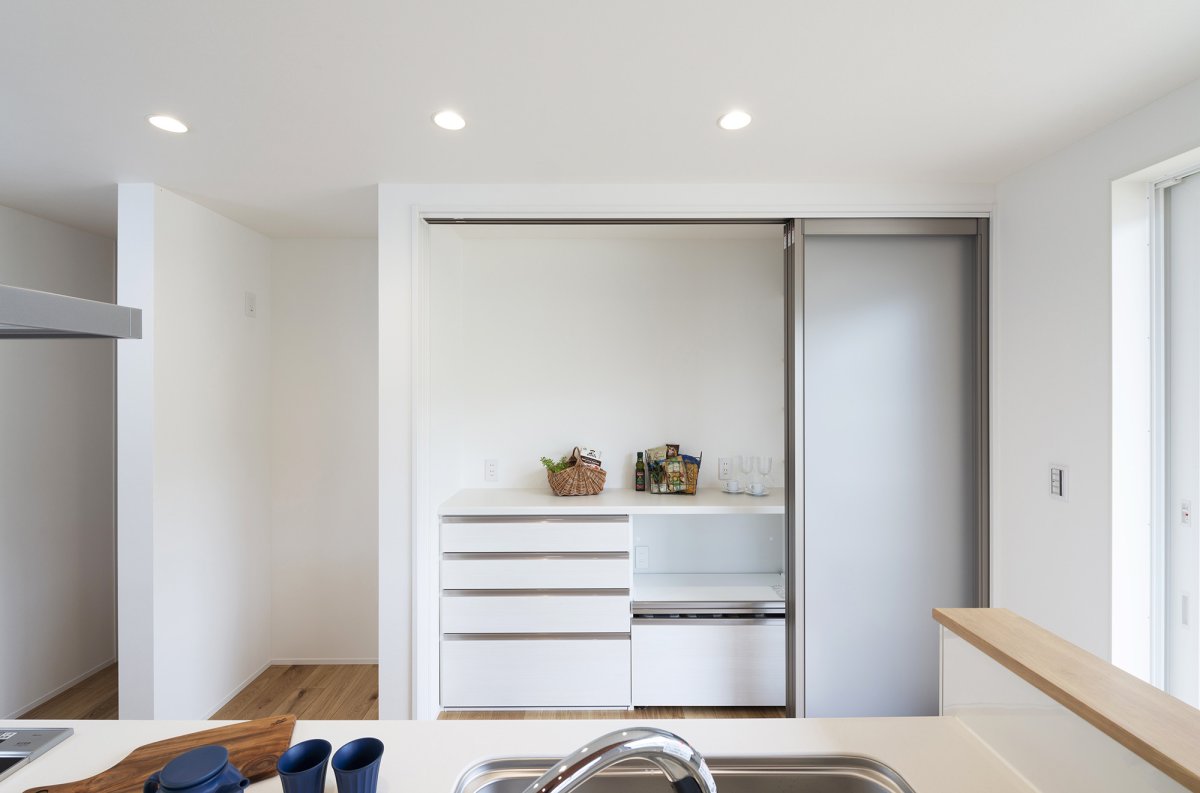 またキッチン後ろにあるアクリル3枚建て引き戸を開けるとそこにはカップボードが。