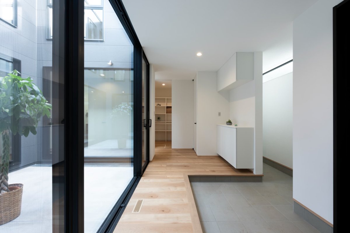 中庭から差し込む陽の光により、あたたかく圧倒的な開放感のある玄関ホール。