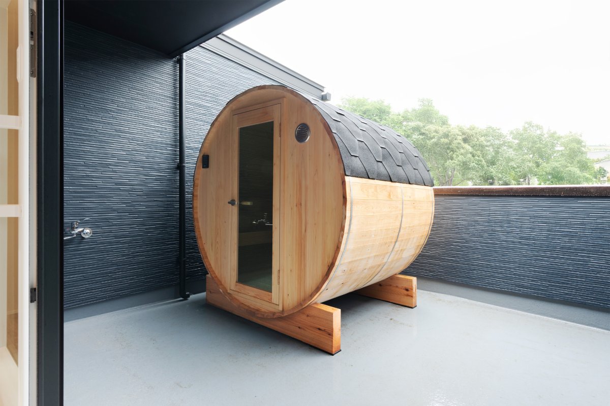 バルコニーには、家庭用のバレルサウナ。