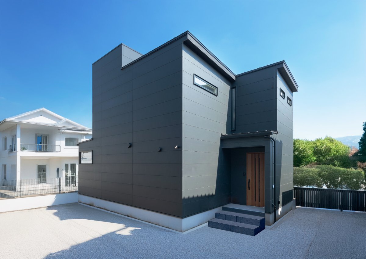 ブラックで統一された、屋上バルコニー付きの3階建てのお家です。