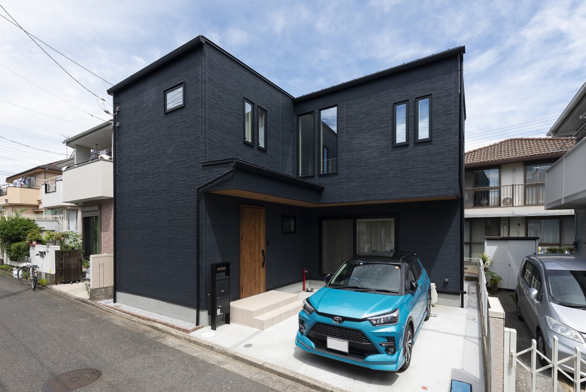 ネイビーと木目調のスクエアタイプのお家。