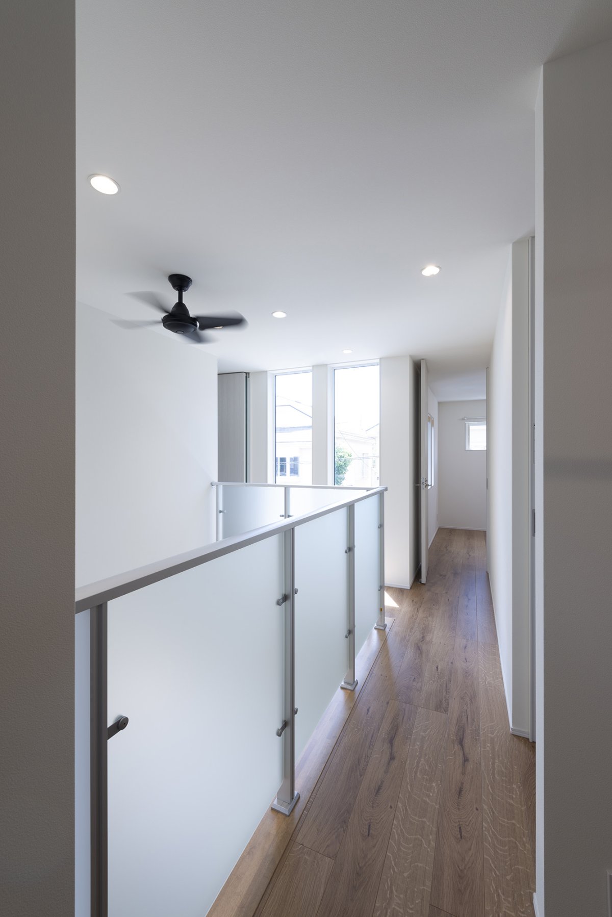 縦長の窓、レイスル―手摺でスタイリッシュな印象の吹抜け空間に。
