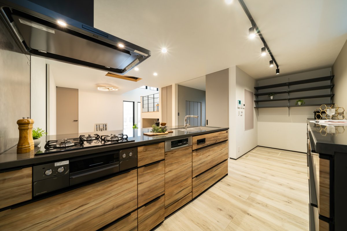 LDKから見えない位置にパントリーを配置し、生活感を見せない工夫を。